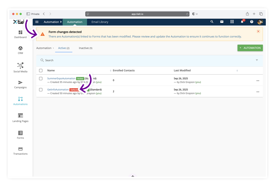 If a Form has been updated but Automations haven’t, a banner appears across the top of the Automations listing page:
