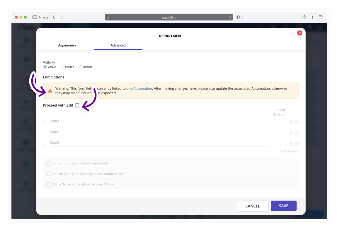 ⚠️ Warning: This form field is currently linked to Automation. After making changes here, please also update the associated Automation, otherwise they may stop functioning as expected.