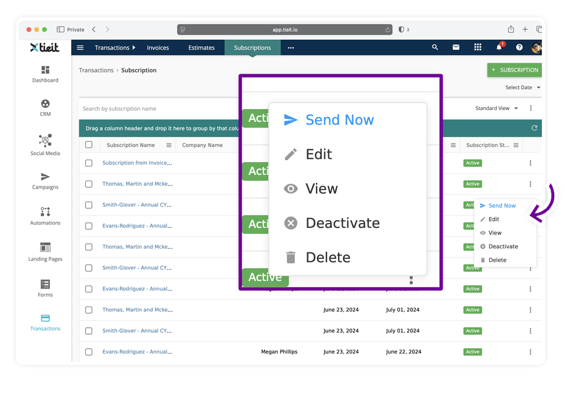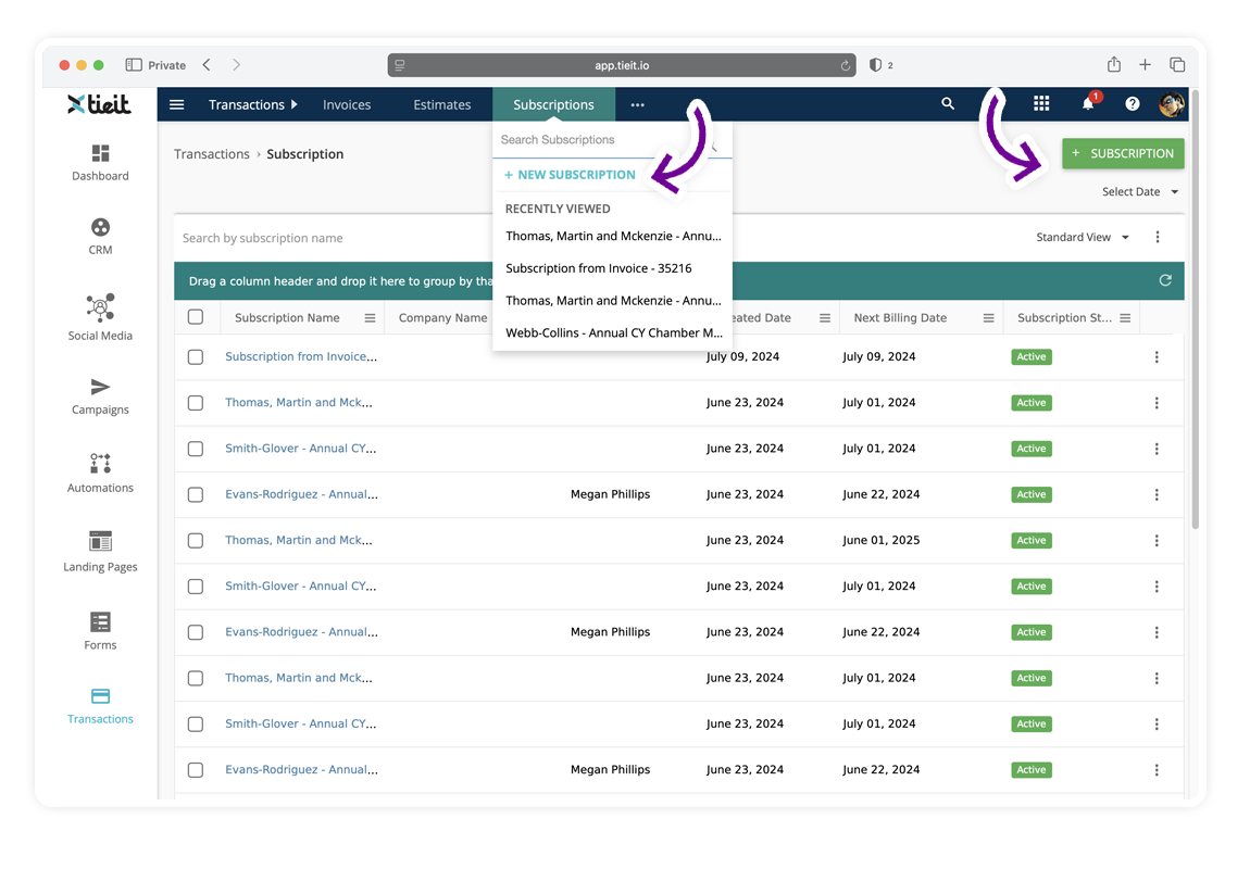 - Subscriptions appear under the Transactions tab only if the subscription was created with that company.