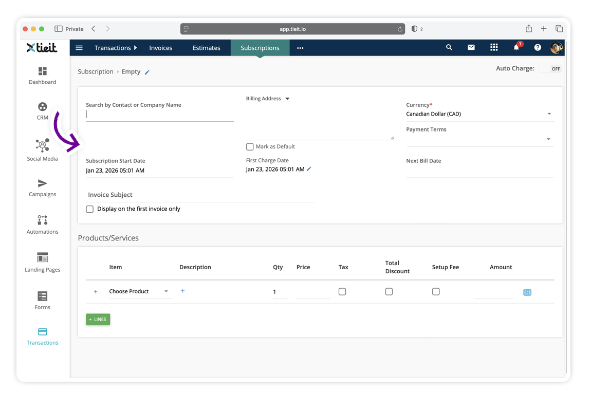 - Navigate to the Transactions module > Subscriptions > + New Subscription.