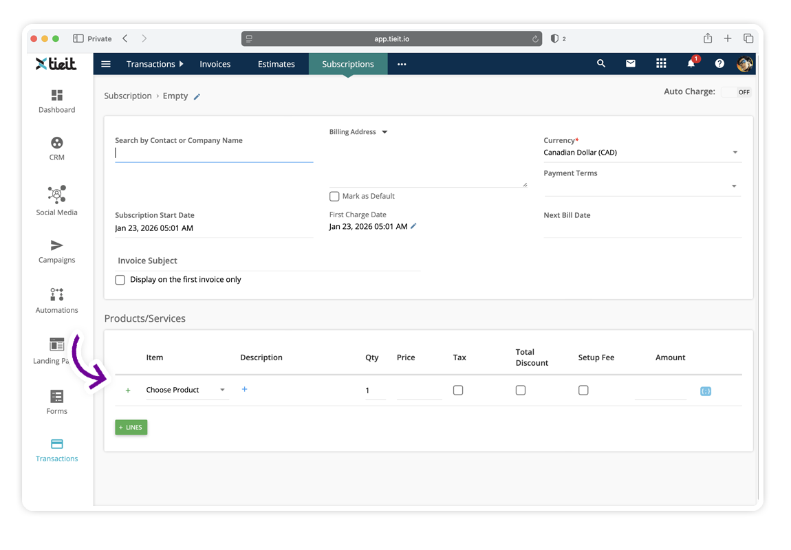 Use the Products/Services section to add line items. At least one recurring product must be associated with the account to create a subscription.