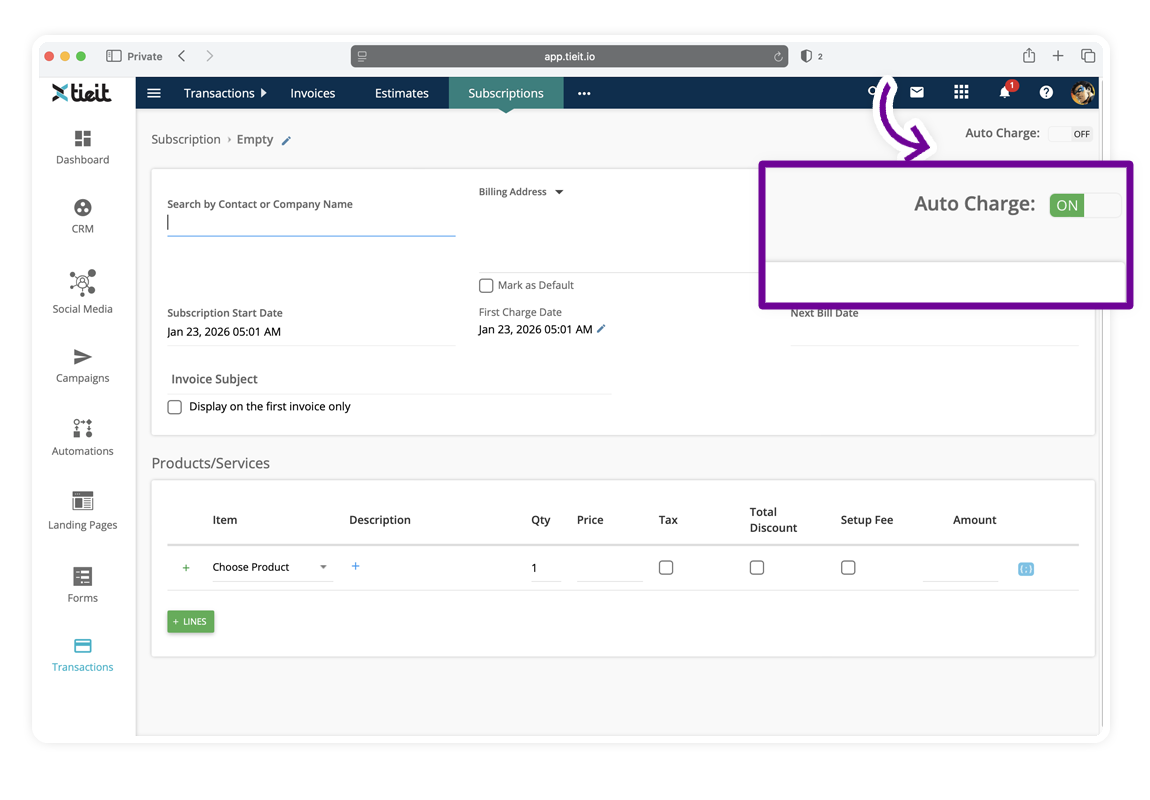 When turned ON, TIEIT will process subscription invoices automatically using the default card on file for the selected contact.