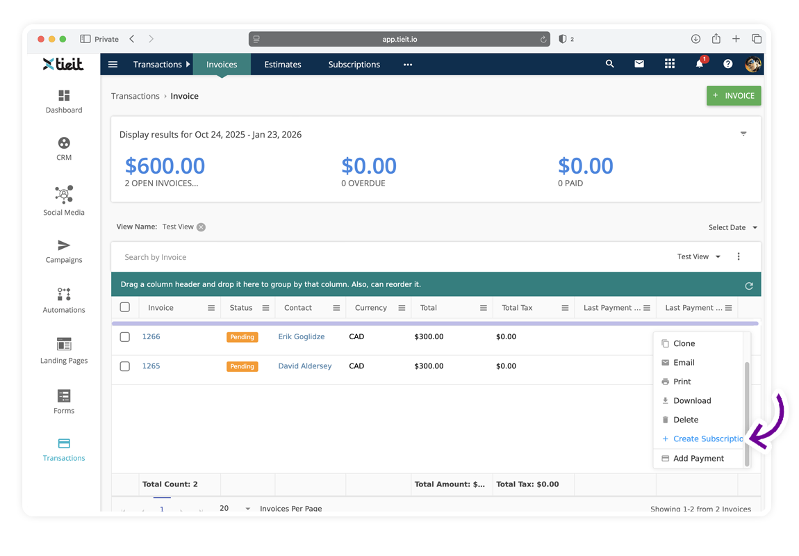 - Subscriptions linked to a contact appear under the Transactions tab.