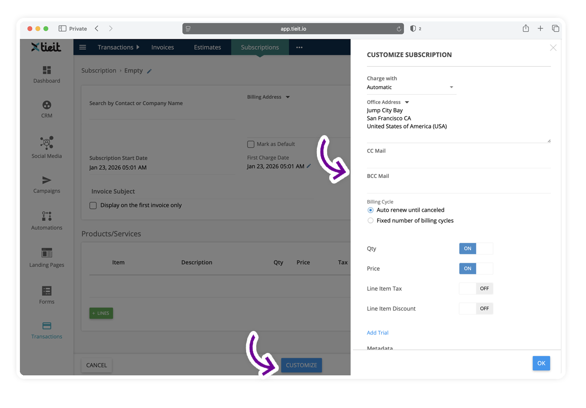 A Subscription represents a recurring billing agreement between you and a contact or company in TIEIT. It generates invoices on a defined schedule based on products or services you select, and optionally charges those invoices automatically using saved payment methods.
