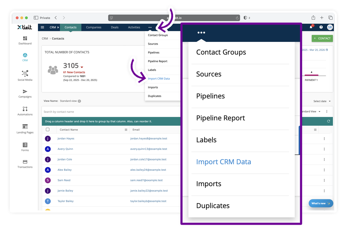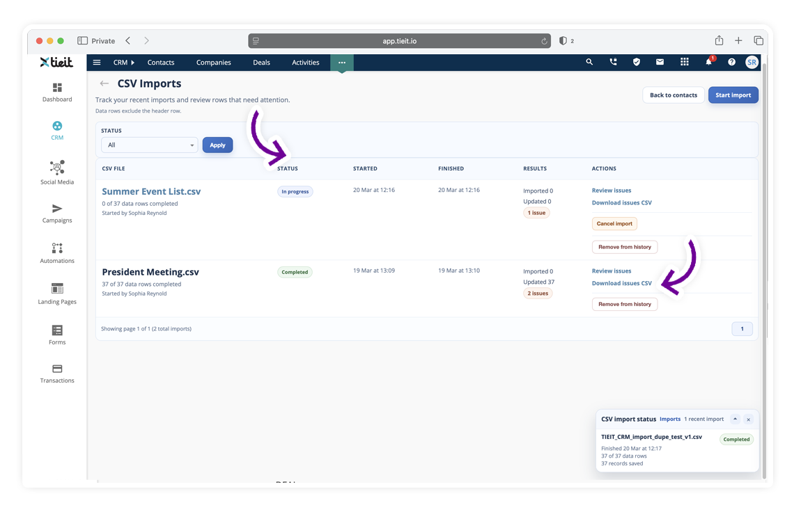 TIEIT allows you to import contacts and other CRM data using a CSV file. The import process is designed to help you map your data correctly, validate it before import, and review any issues after the import is completed.