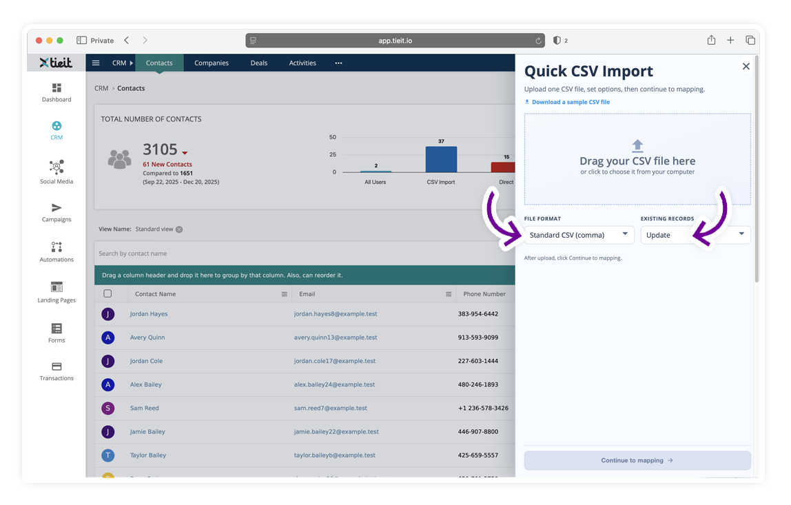 After uploading your file, TIEIT guides you through mapping your CSV columns to CRM fields.