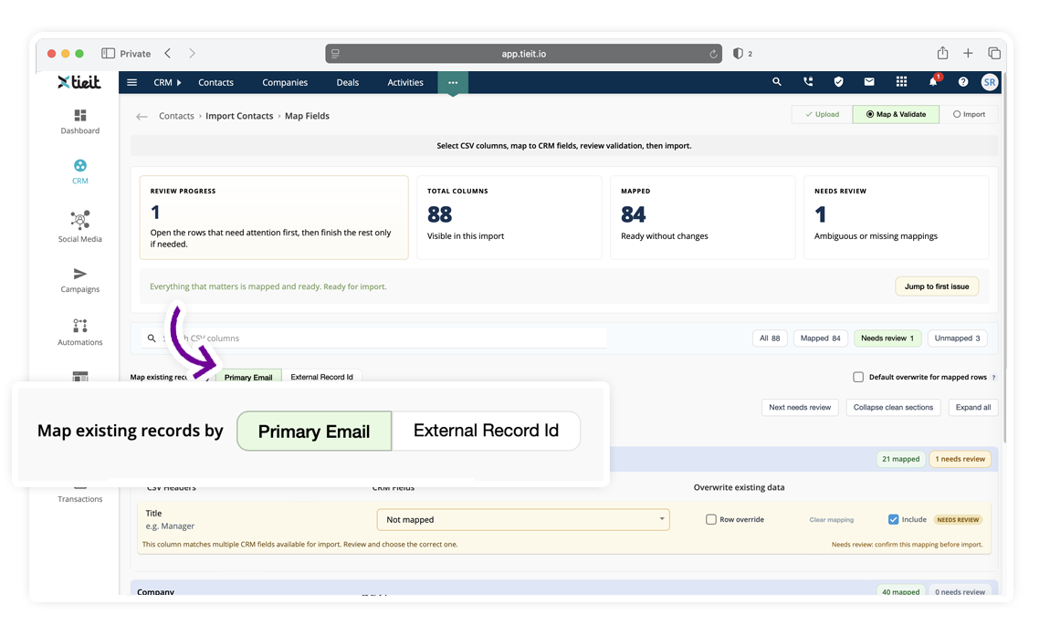 If a column matches multiple CRM fields (for example, “Location”), TIEIT will flag it as Needs Review.